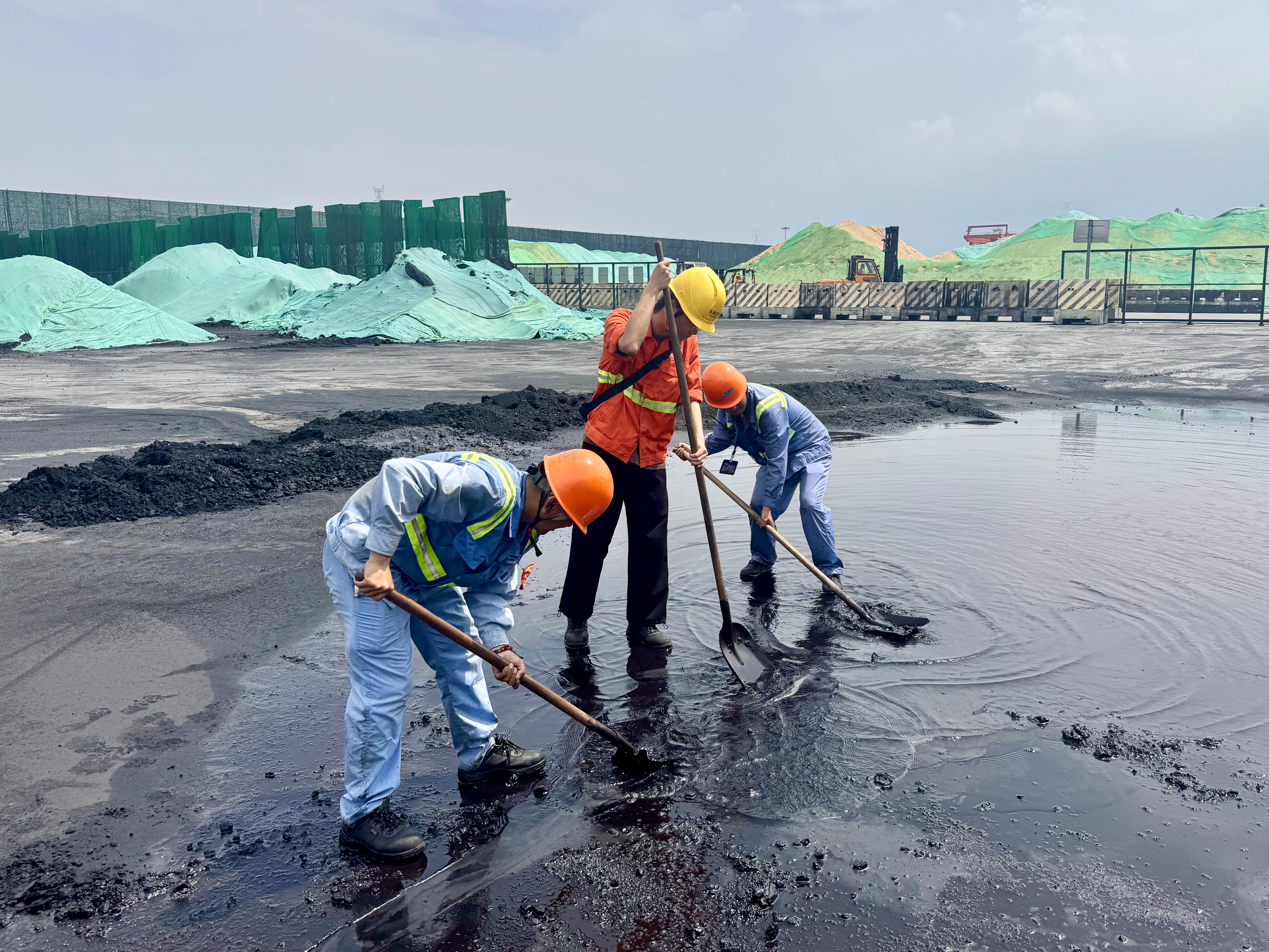 与此同时,另一组志愿队伍对203堆场的排水沟开展清淤疏通作业。面对沟内堆积的淤泥和堵塞的杂物,大家卷起衣袖,手持铁锹、扫把,不畏高温与脏累,协力奋战 ,逐段清理打通排水“堵点”,保障了作业区域排水畅通,消除潜在的安全隐患,切实提升了汛期排涝能力。
