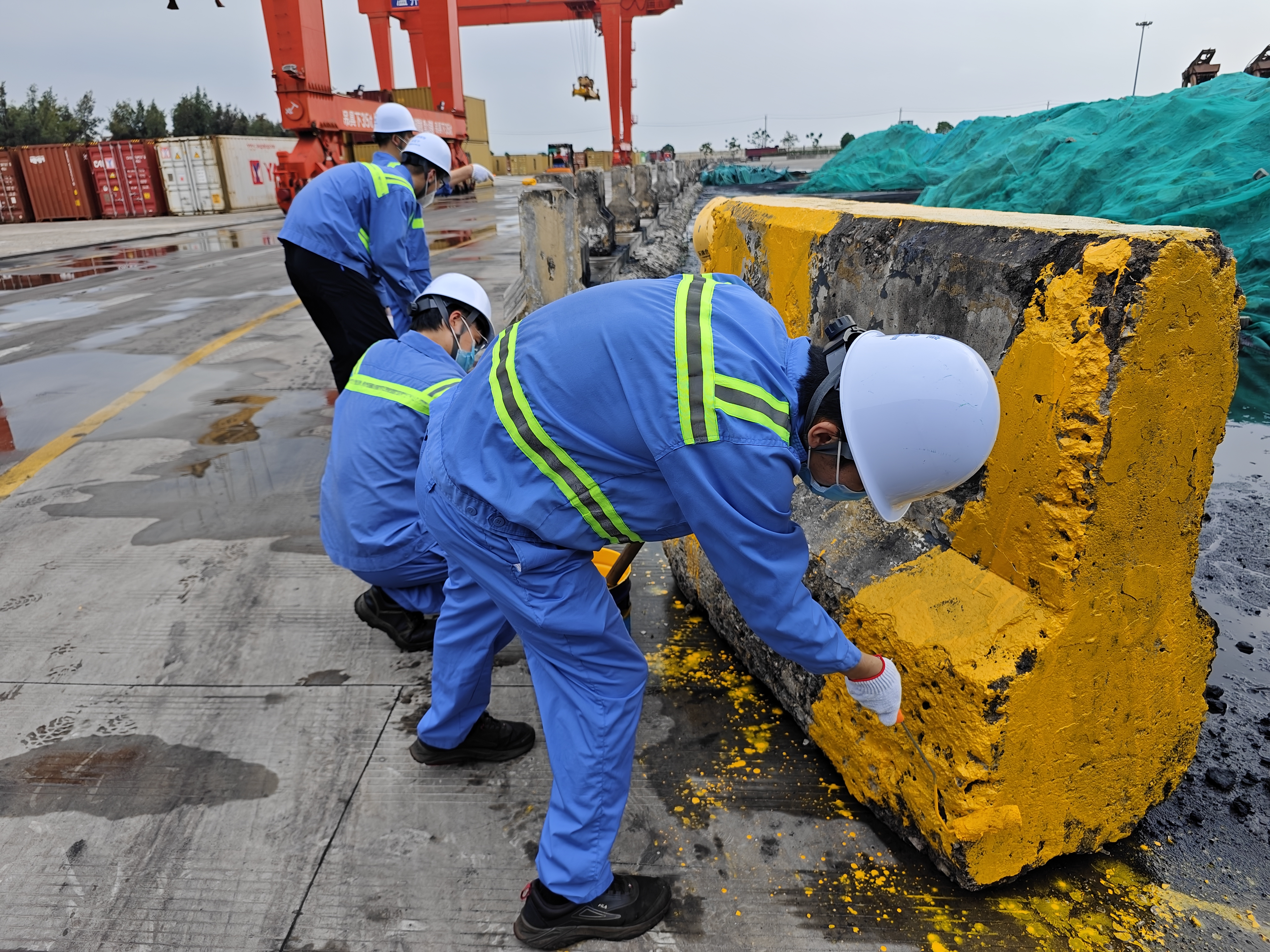 在港区的主干道沿线,志愿队伍化身港区“美容师”,对200余个因长期日晒雨淋而显得老旧斑驳的隔离墩进行集中翻新。大家分工明确,配合默契,认真完成清洗、除锈、打磨、上漆等工序,确保黄黑警示漆涂刷均匀、线条清晰。经过精心修复,隔离墩焕然一新,不仅有效提升了道路安全警示与引导功能,也让整个港区的视觉形象更加整洁美观。