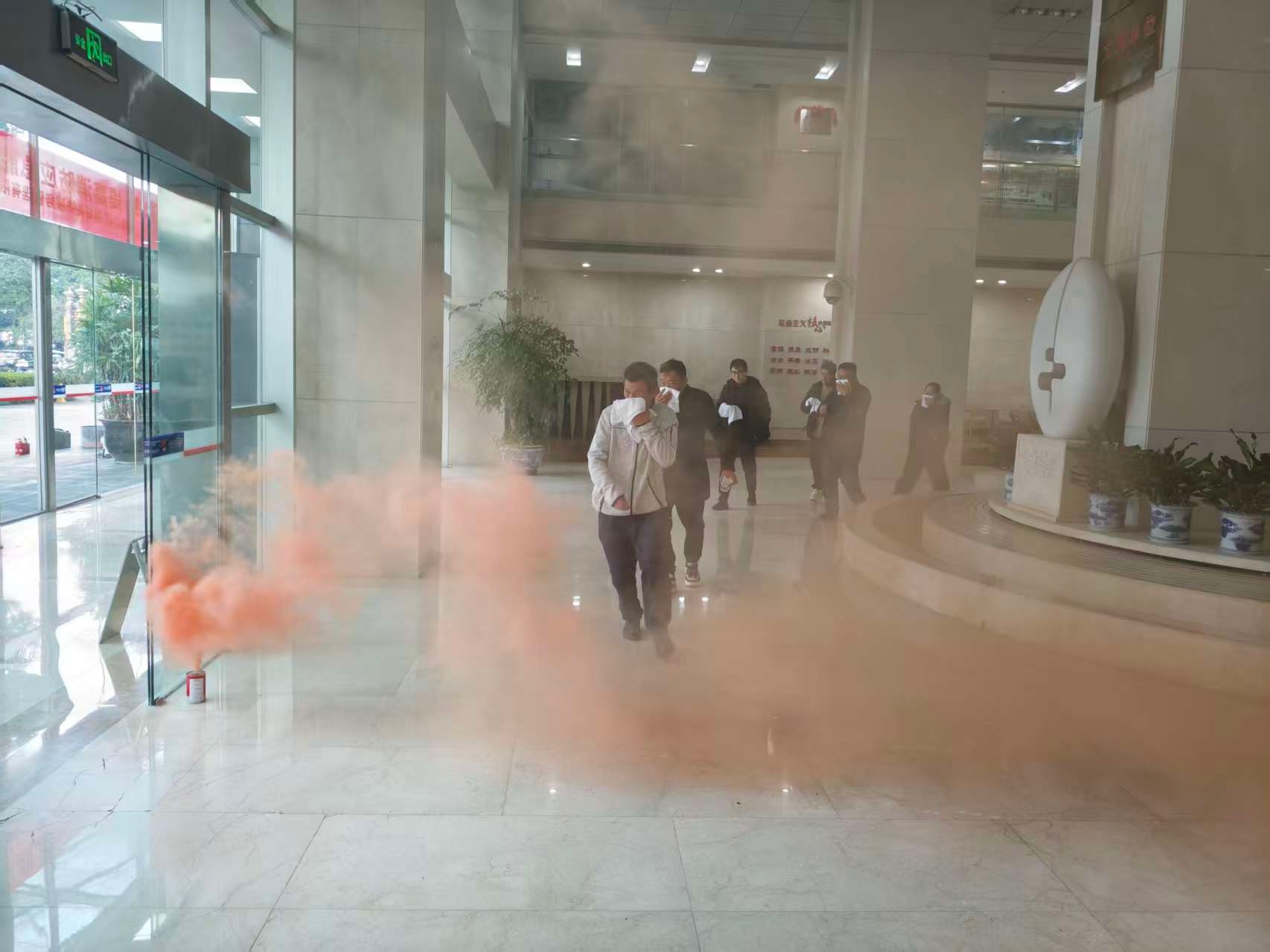 培训结束后,消防应急疏散演练拉开帷幕。此次演练模拟海港大厦1号楼4层餐厅因电器短路引发火灾。现场人员发现火情后,迅速按下手动报警按钮并上报消控室。消控室核实后立即启动应急预案,拨打119报警并向领导汇报。灭火组携带灭火装备快速抵达现场灭火,同时关闭防火门、检查送风系统、禁止使用电梯并设置警戒线。每层人员在引导员指挥下,用湿毛巾捂鼻弯腰低姿疏散至安全地带。