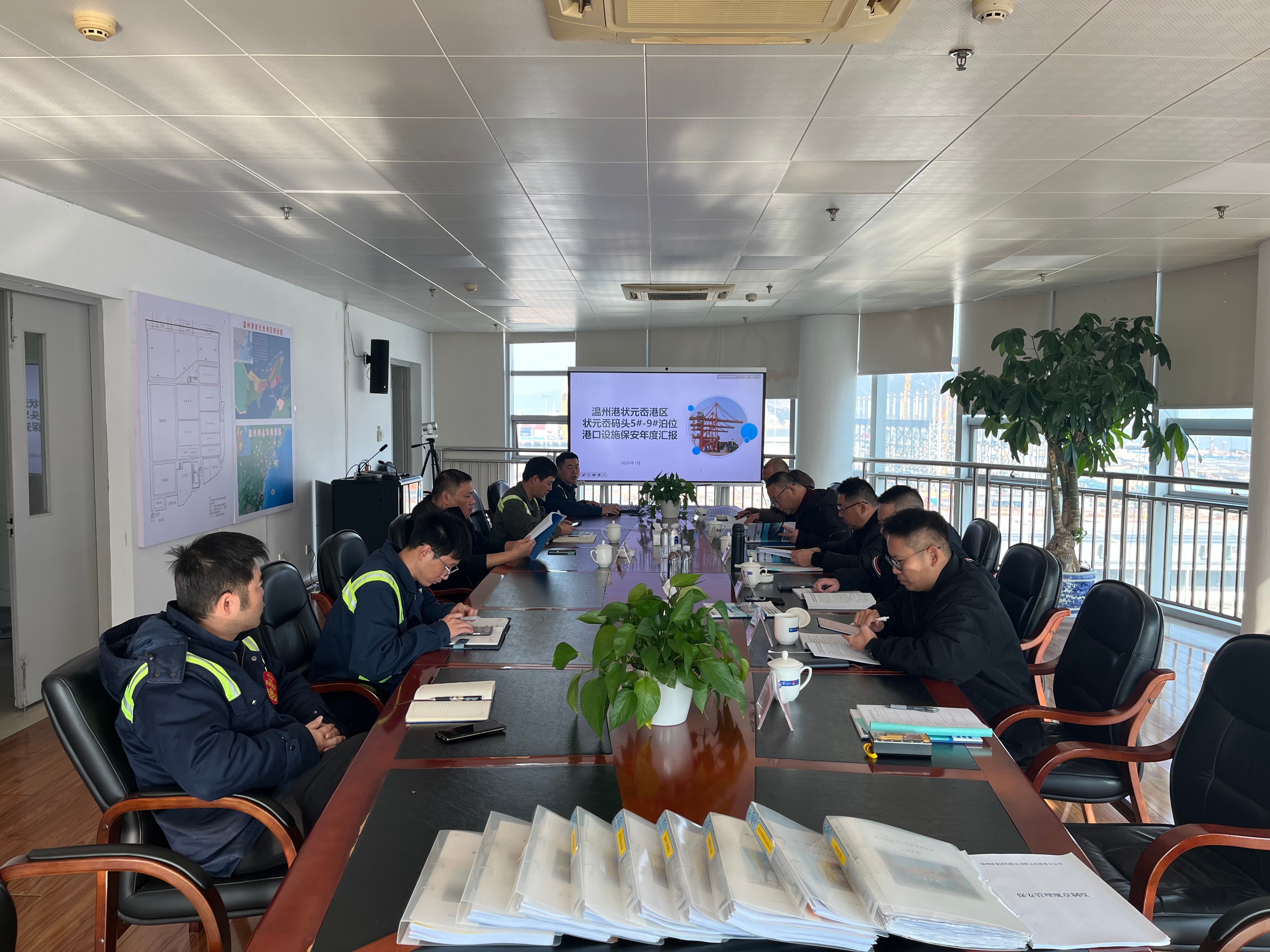 1月16日,温州市港航中心携专家组一行莅临温州港状元岙港区,对状元岙码头5#至9#泊位2025年度港口设施保安履约工作开展现场核验。此次核验严格遵循《中华人民共和国港口设施保安规则》要求,全面检验港区保安工作落实成效,最终状元岙公司凭借规范的管理、扎实的履约能力顺利通过核验,获专家组一致认可。