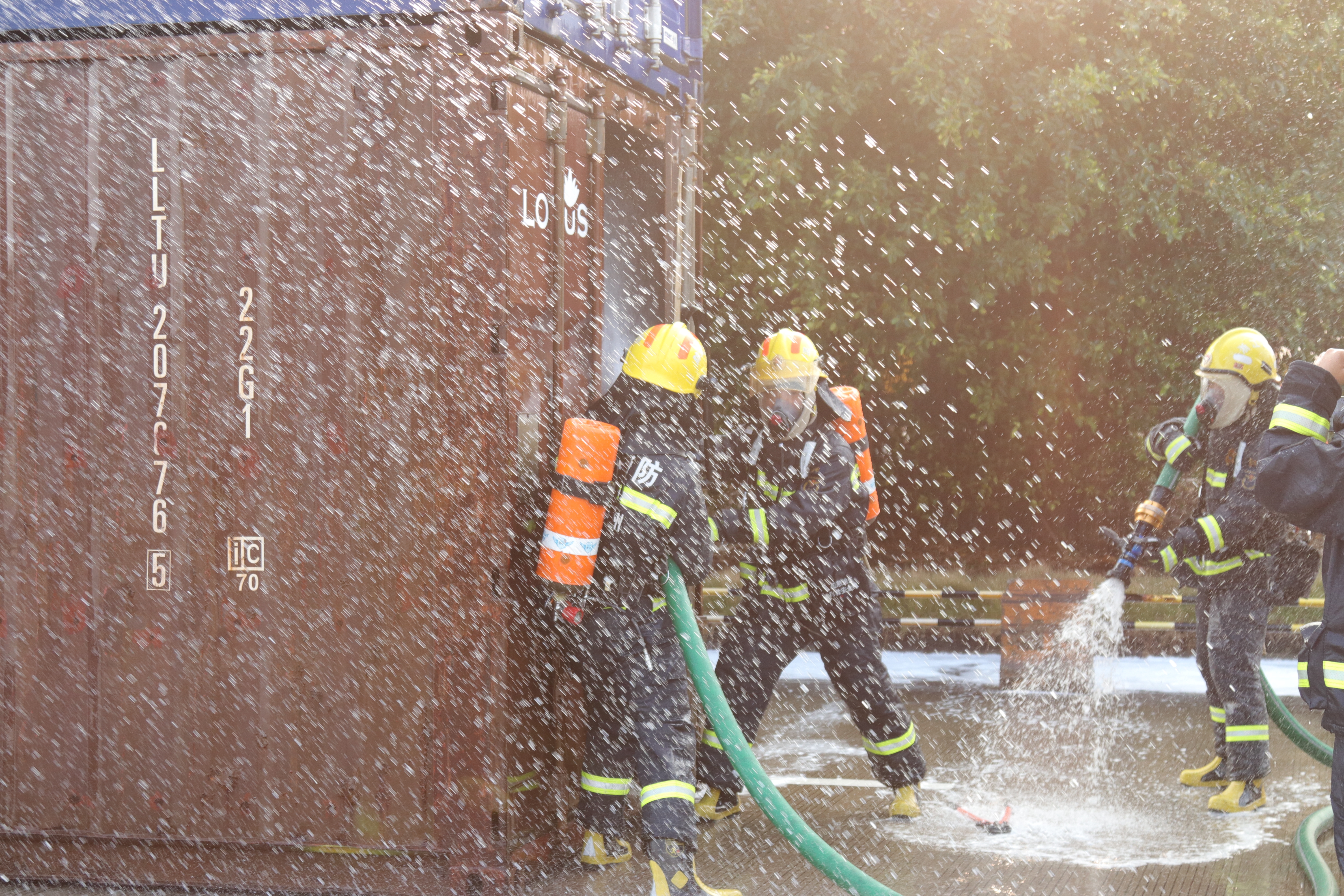 区消防救援局出动20余名消防战士并集结部署多辆消防车、高喷车迅速抵达现场开展灭火救援作业,利用无人机对火场进行高空侦查,高喷车高位喷淋压制,喷洒泡沫灭火剂对集装箱进行隔绝覆盖,对事故箱进行持续喷水降温,缓解事故箱温度升高。确认安全后破拆小组对目标集装箱进行破拆内攻灭火,最终圆满完成所有既定科目演练。