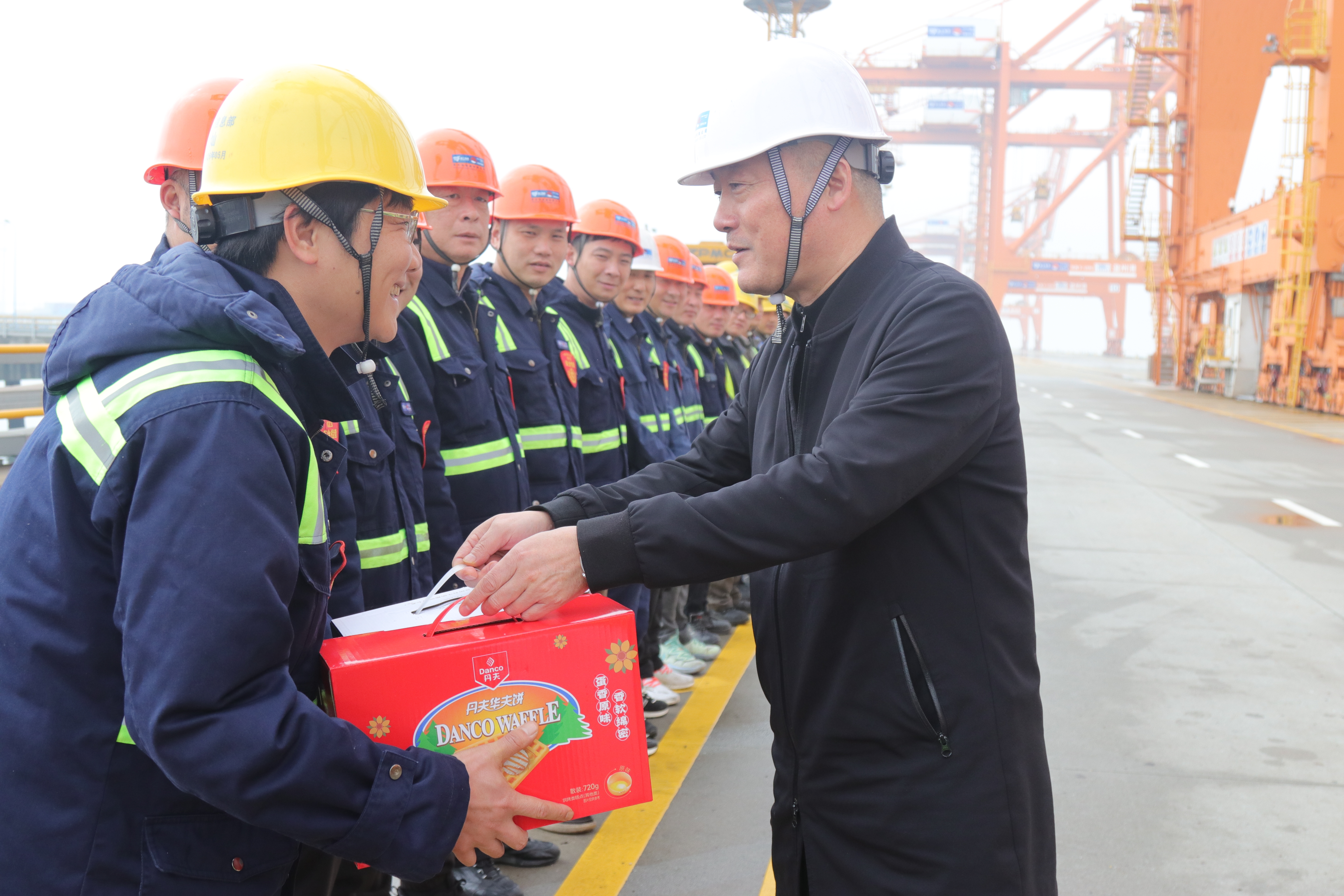 会后,庄雷君带队前往7号泊位作业现场,开展“新春送温暖”慰问活动。在凛冽寒风中,庄雷君亲手为一线职工递上春节慰问品,并与职工亲切交谈,详细询问工作强度与防寒措施,感谢他们坚守岗位、默默奉献,用责任与担当守护着港口运转。(通讯员:金凌冰/文 王海燕/图)