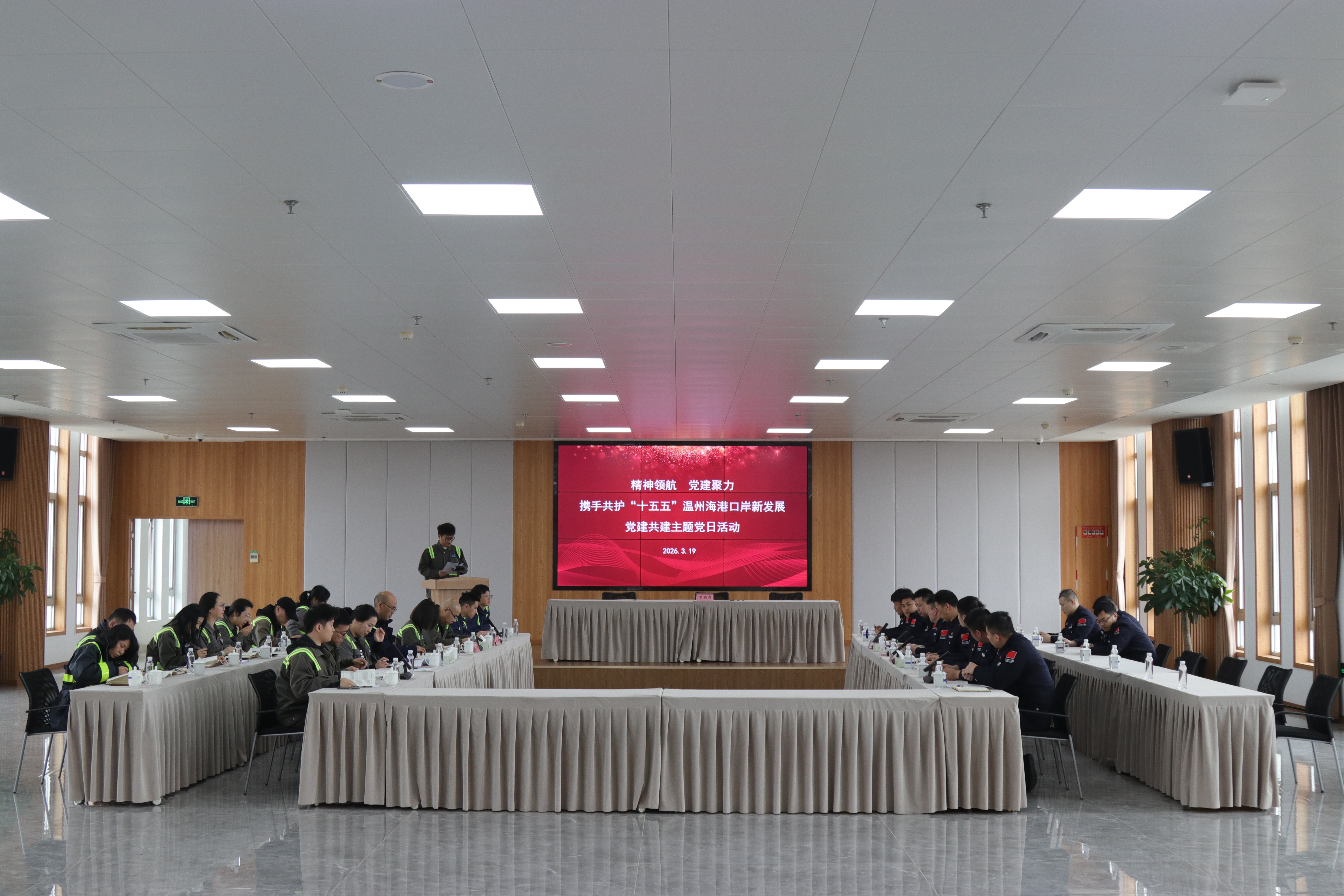 为认真学习贯彻习近平总书记在全国两会期间的重要讲话精神,全面推进“国门党建共同体”建设,3月19日,洞头边检站执勤一队、二队和状元岙公司党总支联合开展“精神领航,党建聚力,携手共护‘十五五’温州海港口岸新发展”党建共建主题党日活动,双方党组织书记、党员代表共计30余人参加。